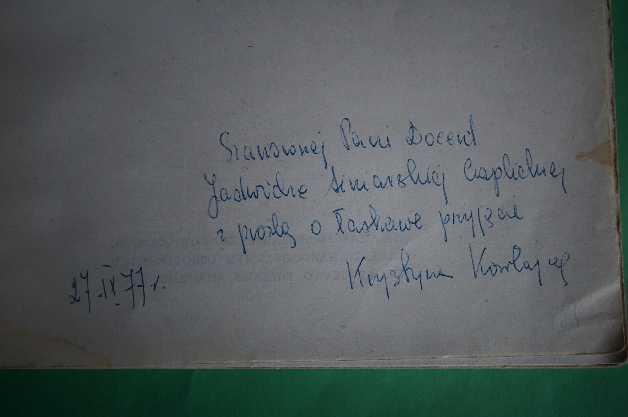 Na karcie przedtytułowej dedykacja Krystyny Korotajowej (wspólautorki) dla Jadwigi Sinarskiej-Czaplickiej (historyka papiernictwa polskiego).