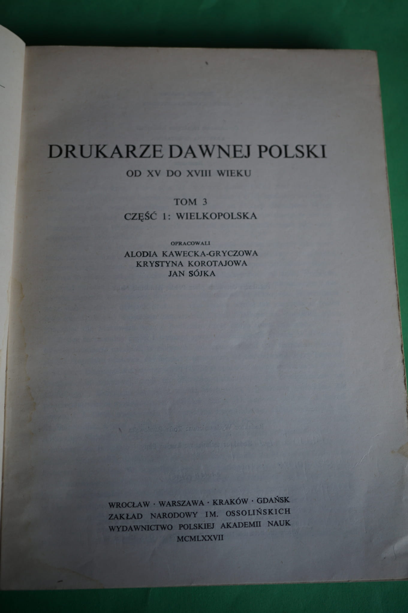 DRUKARZE DAWNEJ POLSKI OD XV DO XVIII WIEKU. Tom 3. Część 1: Wielkopolska. Opracowali: Alodia Kawecka-Gryczowa, Krystyna Korotajowa, Jan Sójka.- Wrocław, 1977.- XV, 305 s. + ilustracje + mapa.- Oprawa wydawnicza, broszurowa, przybrudzona. Blok zwarty, ślad zalania początkowych kart od strony grzbietu i dolnego marginesu ilustracji (kredowe karty częściowo sklejone).