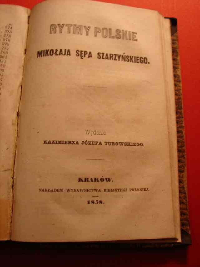 SĘP SZARZYŃSKI Mikołaj: Rytmy polskie. Wydanie Kazimierza Józefa Turowskiego.- + [z własną kartą tytułową]: WISZNIOWSKI Tobiasz: Treny. Wydanie Kazimierza Józefa Turowskiego.- Kraków, 1858.- 69, [1] s.- Oprawa półpłótno, poprawna. Blok całości zwarty i czysty - miejscami rdzawe przebarwienia charakterystyczne dla papieru XIX wiecznego. Na odwrocie k. tyt. Miaskowskiego prywatna piecz. własnościowa, adnotacje ołówkiem i długopisem. Stan ogólny dobry.