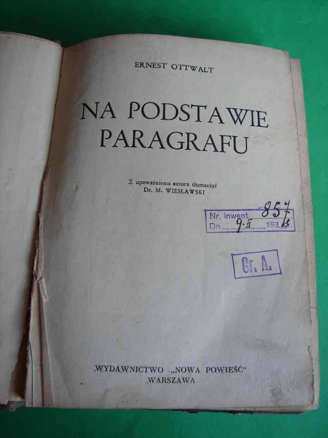 OTTWALD Ernst: Na podstawie paragrafu. [Powieść].- Warszawa, 1938 ?.- 383,[1] s.- Oprawa półpłótno, biblioteczna, przybrudzona. Blok poprawny.
