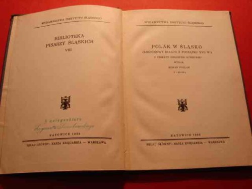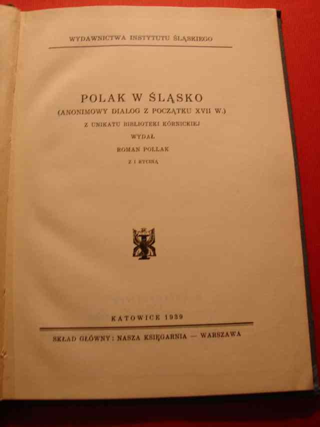 POLAK W ŚLĄSKO. (Anonimowy dialog z poczatku XVII w.) Z unikatu Biblioteki Kórnickiej wydał Roman POLLAK.- Katowice, 1939.- XVI, 27 s., il.- Oprawa płótno. Blok czysty i zwarty - miejscami podkreślenia i adnotacje, prywatne piecz. własnościowe.