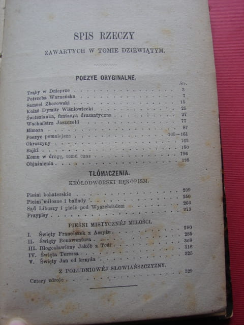 SIEMIEŃSKI Lucjan: Dzieła. Tom IX. Poezje.- Warszawa, 1882.- 328, [2] s.- Oprawa półpłótno, zniszczona, grzbiet uszkodzony. Blok zwarty, znacznie poluźniony w oprawie, karta tyt. i kilka początkowych s. przybrudzonych.