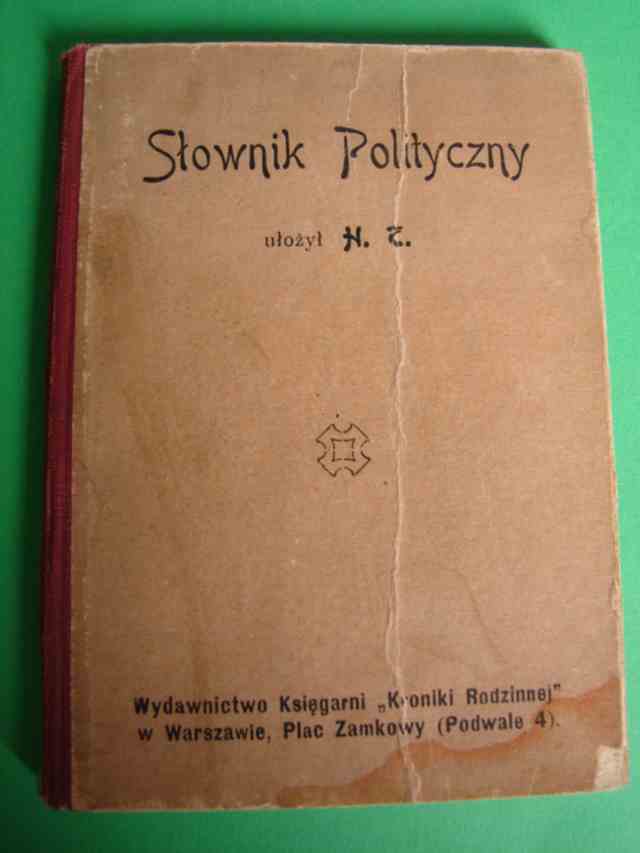H.Z. [krypt.]: Słownik polityczny.- Warszawa, 1917.- 79 s.- Okł. wyd. nieco podniszcz., stan ogólny dobry. Format 13,5x9,5 cm.