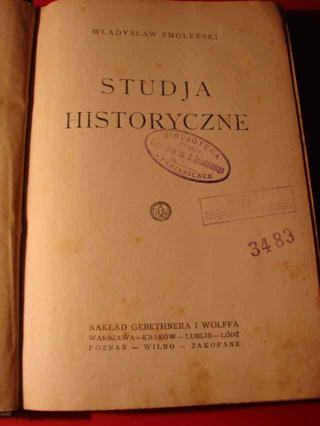 SMOLEŃSKI Władysław: Studia historyczne.- Warszawa, 1925.- 328 s.- Oprawa półpłótno, podniszczona. Blok zwarty, w stanie dobrym. Na k. tyt. i in. nieaktualne piecz. biblioteczne.
