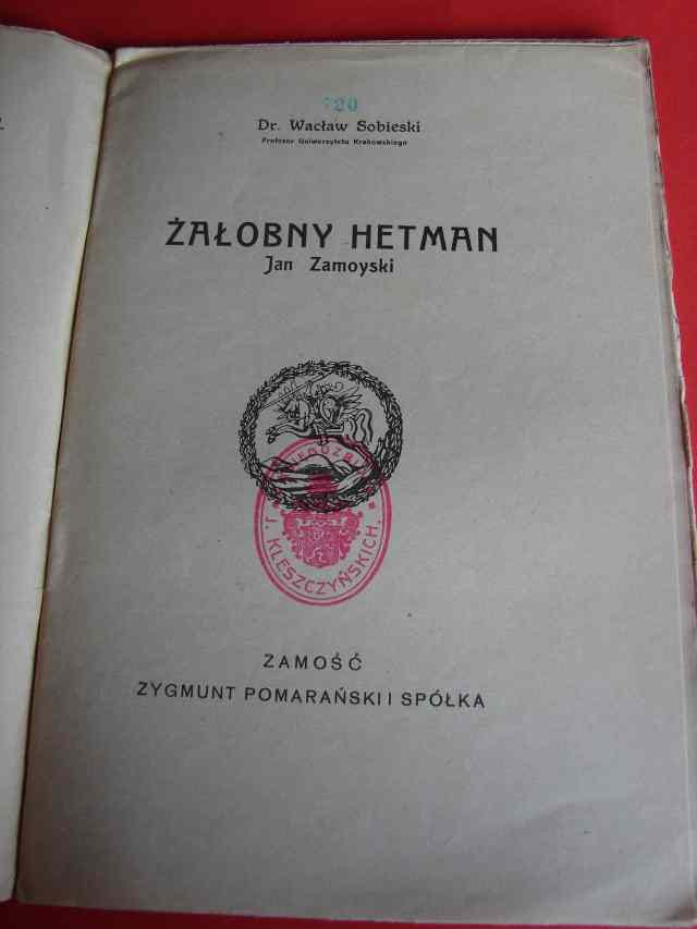 SOBIESKI Wacław: Żałobny hetman JAN ZAMOYSKI.- Zamość, ok. 1920.- 32 s.- Okładki wydawnicze, broszurowe. Stan b. dobry. Na k. tyt. heraldyczna pieczęć własnościowa.