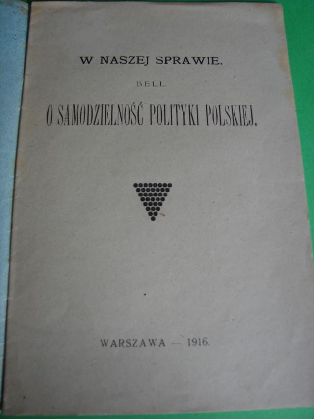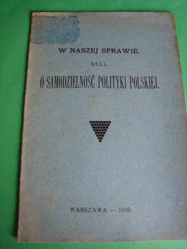 [MOSZCZEŃSKA Iza] BELL. [pseud.]: W naszej sprawie. O samodzielność polityki polskiej. - Warszawa, 1916.- 16 s.- Okładki wydawnicze broszurowe, przebarwione w górnej partii.