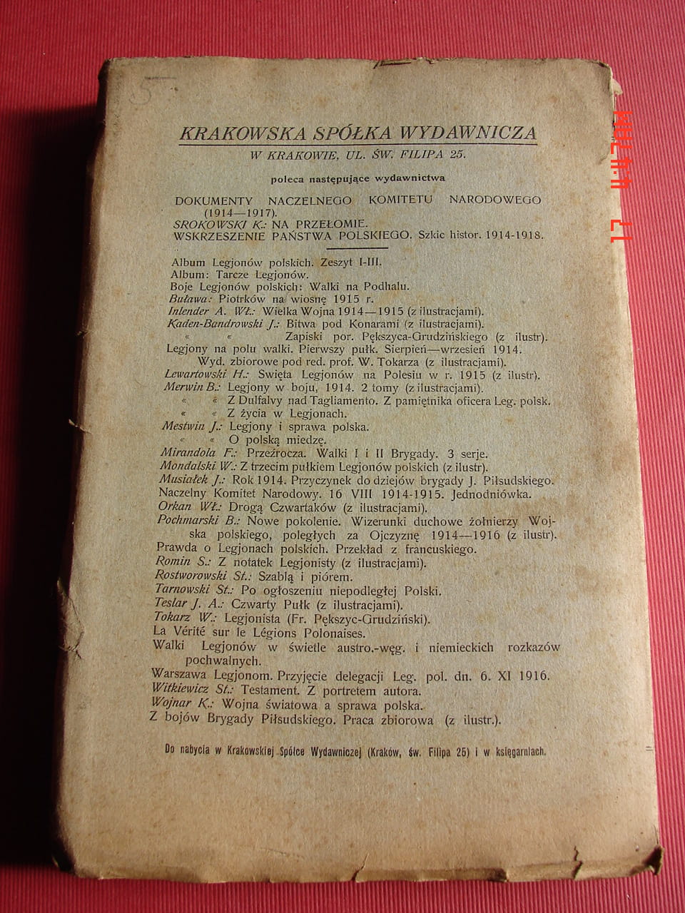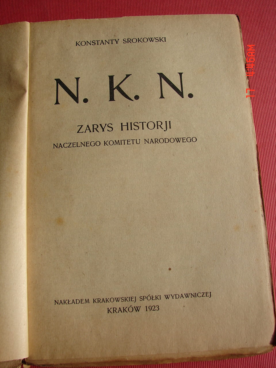 SROKOWSKI Konstanty: N.K.N. Zarys historii Naczelnego Komitetu Narodowego.- Kraków, 1923.- VII, 380 s.- Okładki wydawnicze, broszurowe, podniszczone, przykurzone i odbarwione (zwłaszcza wierzchnia). Blok czysty i zwarty, nierozcięty.