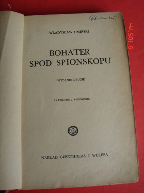 UMIŃSKI Władysław: Bohater spod Spionskopu. Wydanie drugie. Z 5 rycinami J. Bełdowskiej.- Warszawa, 1937.- 227, [1] s., il.- Oprawa półpłótno, wydawnicza, podniszczona, grzbiet postrzępiony. Blok w stanie dobrym, na końcu i w tekście prywatne znaki własnościowe.