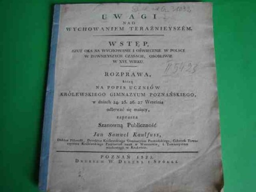 KAULFUSS Jan Samuel: Uwagi nad wychowaniem teraźniejszem. Wstęp. Rzut oka na wychowanie i oświecenie w Polsce w dawniejszych czasach, osobliwie w XVI wieku. Rozprawa, którą na popis uczniów Królewskiego Gimnazjum Poznańskiego w dniach 24.25.26.27 września odbywać sie mający zaprasza ... - Poznań, 1823.- 26 s..- Brak okładek. Stan b. dobry.