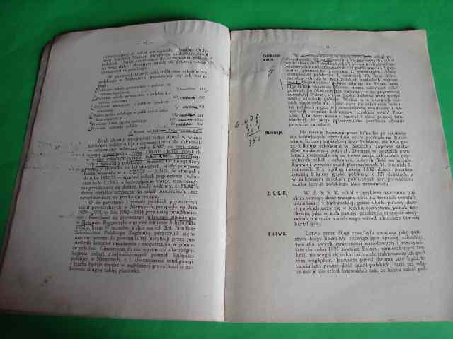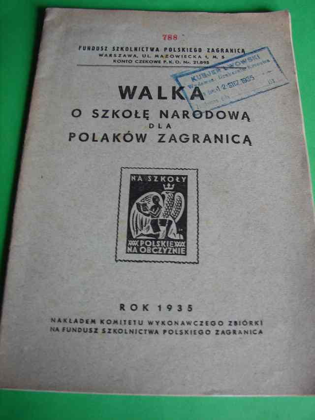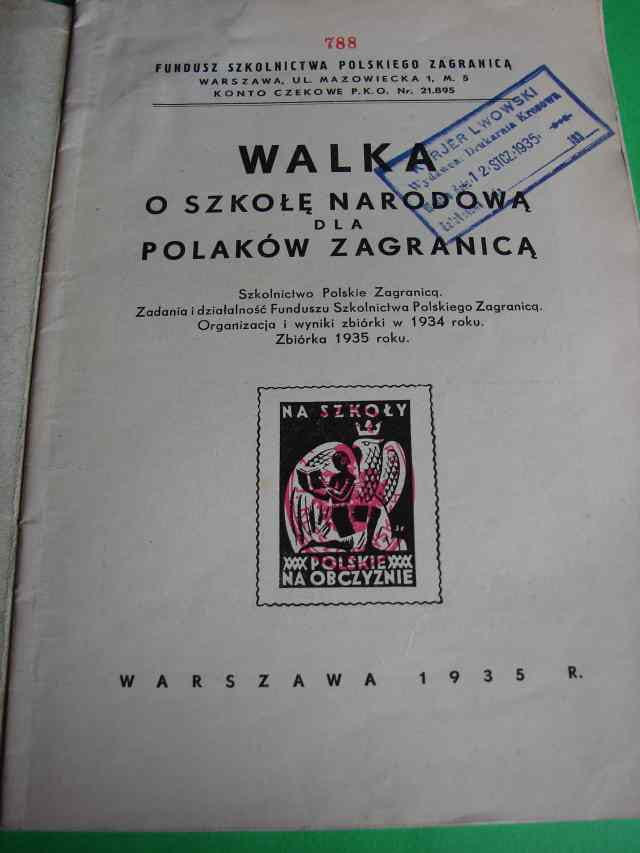 WALKA O SZKOŁĘ NARODOWĄ DLA POLAKÓW ZA GRANICĄ.- Katowice, 1935.- 35 s., il.- Okładki wydawnicze broszurowe. Róg górnego marginesu ze śladem zalania na całej objętości bloku książki. Na k. tyt. pieczęci własnościowe: prywatna heraldyczna i Kuriera Lwowskiego. W tekście poprawki i uwagi - piórem.