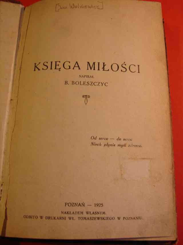 [WOLNIEWICZ Jan]: Księga miłości. Napisał B. Boleszczyc [pseudonim]- Poznań, 1925.- 160 s.- Oprawa półpłótno podniszczona. Blok zwarty, z umiarkowanymi śladami lektury.